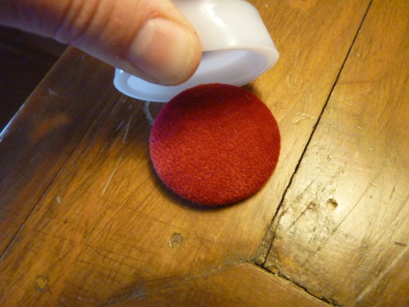 Step 15) Cover your buttons with small circles of leftover pillow fabric. Or, an alternative is to buy matching or decorative buttons that you'd like to put in the middle of the pillow. I've only ever covered buttons with messy fabric glue, but decided this time to get a button cover kit that came with two 1 1/4 inch buttons and a little gadget for snapping the back on the button to hide the fabric edges in between. I bought this thing for under $3 at Joann's and it was super simple and nifty: