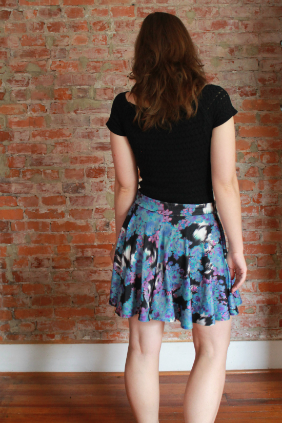 I decided to make my culottes in a knit fabric because... because! I just tend to have a higher proportion of stretchies in my stash and I liked this watercolor print. It's a stable jersey or somethin' from a local discount fabric store. The pattern calls for woven fabrics and an invisible side zipper. I eliminated the zipper, so I sewed both side seams, constructed the waistband all together then attached it as one to the waist of the culottes. I serged elastic to the seam allowance of the waist so it doesn't stretch out when I go to pull the waist over my not-so-tiny hips. So it's a bulky seam, oh well.