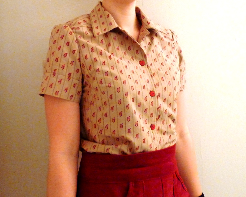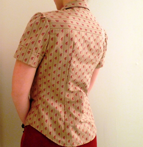 The shape's a bit too boxy from the front, so I think I will only wear it tucked in with a higher-waisted skirt. The back has a nice shape because of the long darts, but the front looks a little bit like a bowling shirt. Here is the back, untucked: