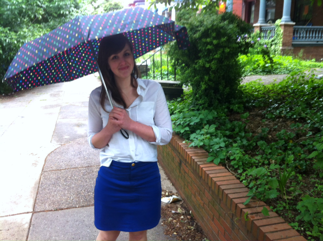 White Archer shirt (blogged here) and blue denim Moss Mini skirt (blogged for my 80s challenge here). A Grainline Studio Pattern kinda day! I finished this skirt on Saturday morning so was pumped to wear it out. But it looks like I wore this outfit to bed, damn. Tuck your shirt in! Use an iron! Well, I wore it to eat French fries and drink beer, so I was not projecting much elegance today as it was. Cute 'brella, though, amirite? Cute Philly sidewalk litter, amirite?