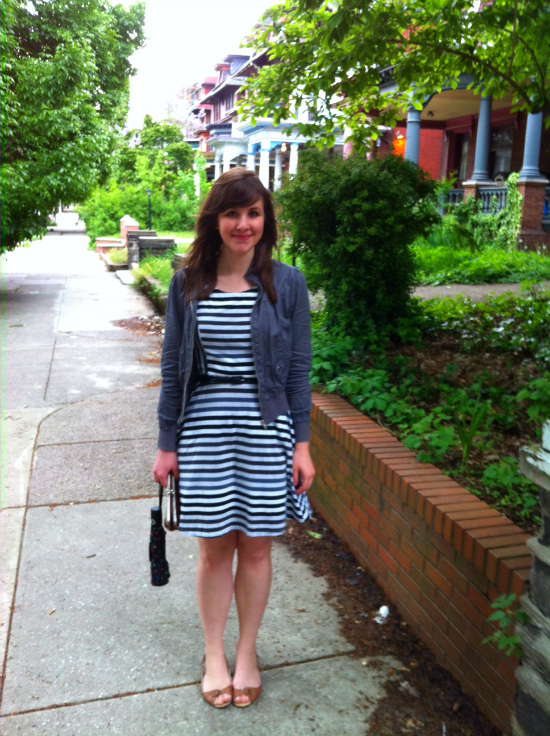 Stripey jersey dress (blogged here). Ooh nice awkward iPhone photo, taken on our walk back from an Indian food gnosh fest. I look so short and red in this photo! Is Corey 8 feet tall? I was thrilled to remember that I had this dress tucked back in the depths of my closet. I wore it several times in the winter but never felt that comfortable because cotton jersey and thermal tights do not get along well. I think the dress looks better with bare legs, so I'm glad to officially bring it into my warm weather wardrobe rotation. It has a coffee stain on the skirt front now but do I look like i.g.a.d?