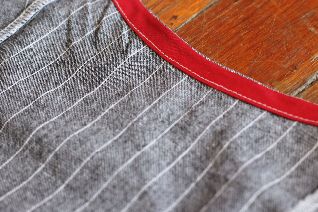 I didn't re-read the pattern instructions so I don't remember how it has you finish the neckline and armholes, but bias tape made the most sense to me. Of course I used red bias tape. Of course!