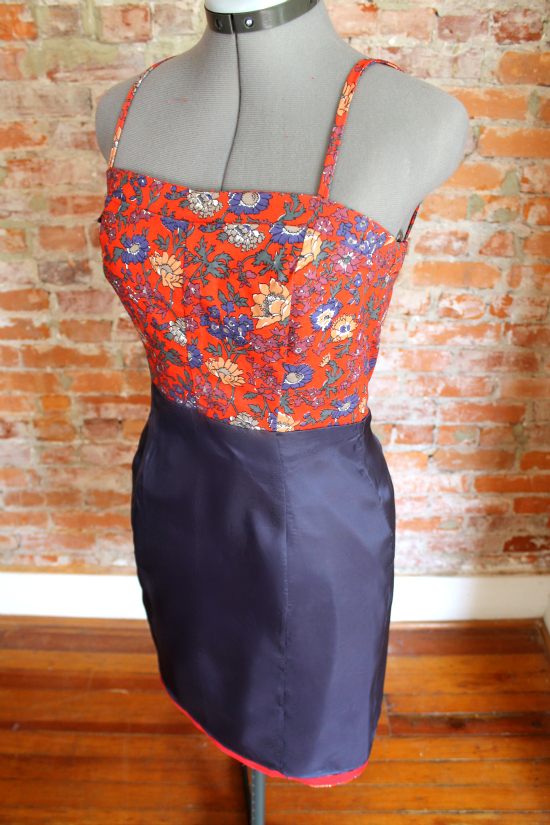 The dress is fully lined, which I kind of made up as I went. The skirt portion is rayon bemberg with French seams. I hemmed the skirt shell with red bias tape and a hand-sewn blind stitch. It's super invisible on this print!