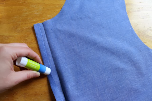 I've always used a glue stick to help attach centered zippers on skirts, ever since I saw this tutorial on Sew Mama Sew a million years ago. Now I use one throughout the shirtmaking process, too, particularly when I need to secure something on the inside while sewing from the right side. To me, glue makes it easier to control the fabric and get it perfectly positioned, and can be faster than basting and more secure than pinning, especially on slippery fabrics that will immediately shift as you remove the pins during sewing. And the stakes aren't that high -- you can easily reposition something before the glue dries... or even after.