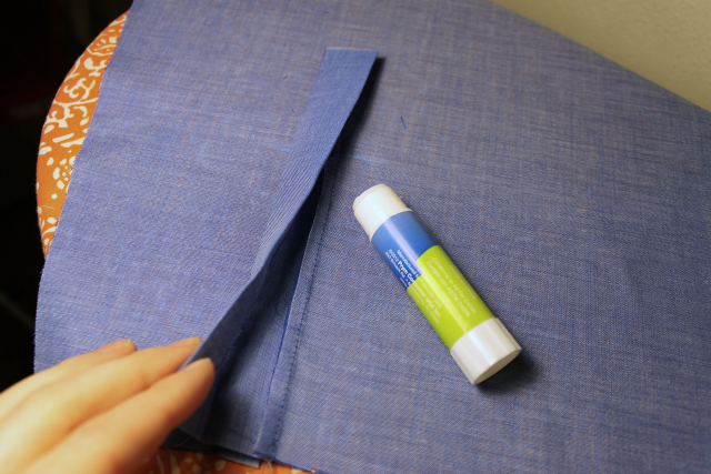 Here I use fabric glue from JoAnn's that claims it is water-soluble and won't "gunk up" your machine needle, but I've also used the regular ole office supply stuff in the past. Here's when I use a glue stick: