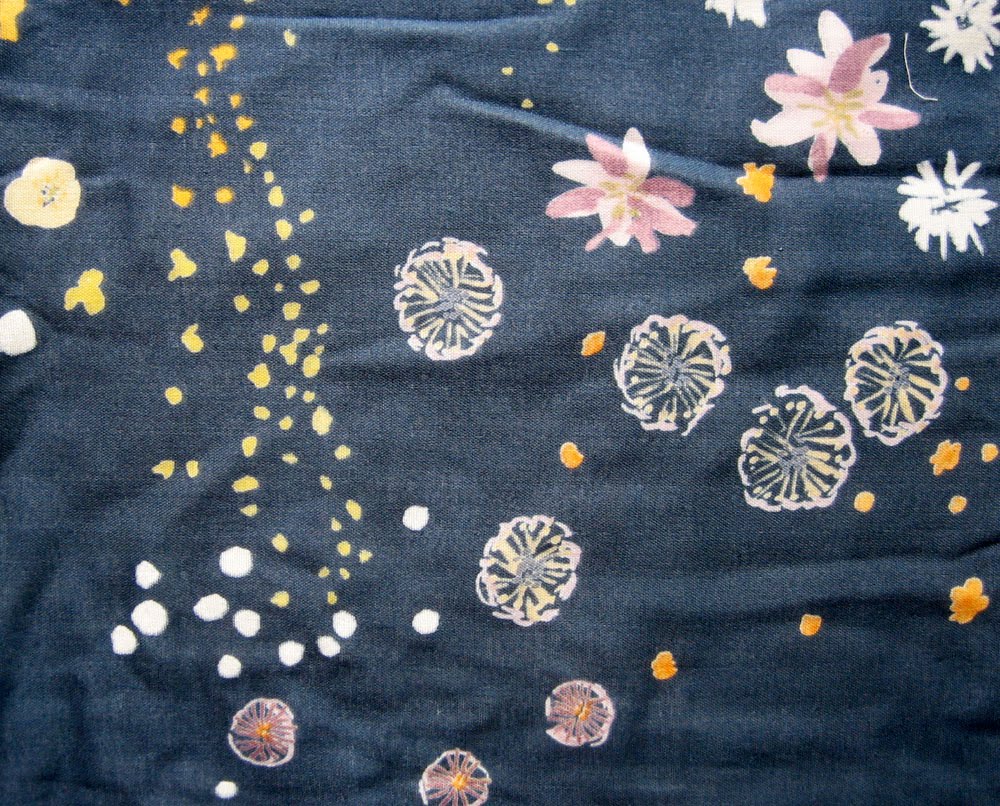 Let's talk prints. In the past couple months on this blog, we've seen chevron prints. We've also seen plaids and stripes and dots, birdies and birdy feathers, blue checks and bigger blue checks. What's obviously missing are florals --the sure sign of summer/wedding season. I guess you could consider my Cambie fabric to be a floral, but I think of it as more of an... abstract weed.